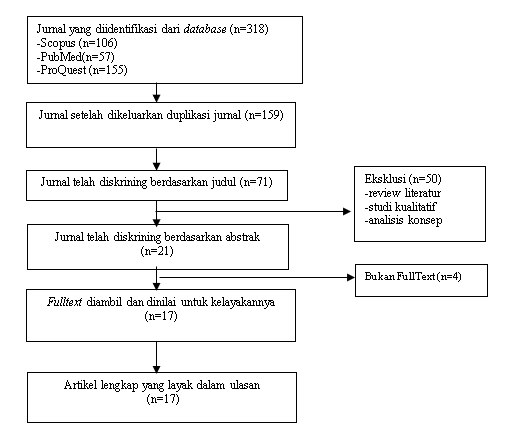 Pencarian dilakukan untuk mengidentifikasi artikel atau jurnal publikasi menggunakan kata kunci pencarian. Kata kunci pencarian didasarkan pada pertanyaan terstruktur PICOS. Tiga kelompok kata kunci pencarian digunakan dan kemudian digabungkan menggunakan operator Boolean AND, OR, dan NOT. Semua kata kunci digunakan di setiap basis data. Artikel atau jurnal yang disertakan dalam kriteria inklusi dibatasi oleh tahun dan bahasa yang digunakan sesuai dengan kriteria inklusi. Basis data daring yang dicari meliputi Scopus, ProQuest, dan Pubmed. Referensi yang sesuai dengan tinjauan sistematis digunakan untuk mengidentifikasi studi lebih lanjut. Artikel dan jurnal duplikat dihapus dan penelitian difilter menurut kriteria inklusi dan eksklusi, berdasarkan abstrak dan judul. Teks lengkap untuk semua artikel dan jurnal yang dapat diunduh dan diteliti oleh peneliti menggunakan alat penyaringan untuk mengonfirmasi bahwa penelitian tersebut memenuhi kriteria inklusi.