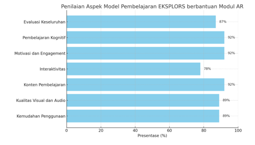 Angka ini lebih rendah dibandingkan dengan aspek lain yang mendekati nilai maksimal (92%). Penurunan skor ini kemungkinan disebabkan oleh desain aplikasi yang kurang optimal dalam mendorong partisipasi aktif peserta didik, atau bisa juga disebabkan oleh keterbatasan perangkat yang digunakan siswa selama uji coba, yang menghambat fungsi interaktif aplikasi AR secara maksimal.