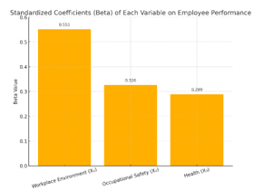 To enhance the clarity of the regression results, a bar chart is presented below to visualize the relative influence (Beta coefficients) of the three independent variables on employee performance. As shown in the chart, workplace environment (β = 0.551) has the strongest influence, followed by occupational safety (β = 0.326) and health (β = 0.289).