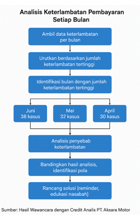 Langkah selanjutnya adalah membandingkan hasil analisis dari ketiga bulan tersebut untuk mengidentifikasi apakah terdapat pola musiman yang mempengaruhi keterlambatan. Setelah pola diidentifikasi, solusi dirancang dalam bentuk pengingat otomatis (reminder) atau edukasi kepada nasabah. Solusi yang telah dirancang ini kemudian diterapkan pada bulan berikutnya sebagai bentuk pencegahan keterlambatan serupa di masa mendatang. Dengan alur ini, perusahaan dapat mengantisipasi dan mengurangi keterlambatan pembayaran secara lebih efektif.