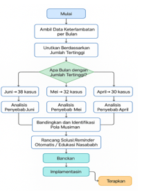 Flowchart pada gambar tersebut menggambarkan proses analisis keterlambatan pembayaran yang terjadi setiap bulan. Proses dimulai dengan pengambilan data keterlambatan per bulan, kemudian data tersebut diurutkan berdasarkan jumlah keterlambatan tertinggi. Setelah itu, dilakukan identifikasi bulan dengan jumlah kasus keterlambatan tertinggi untuk dianalisis lebih lanjut. Dalam contoh yang diberikan, tiga bulan dengan jumlah kasus tertinggi adalah Juni (38 kasus), Mei (32 kasus), dan April (30 kasus), yang kemudian masing-masing dianalisis untuk mencari penyebab keterlambatan.