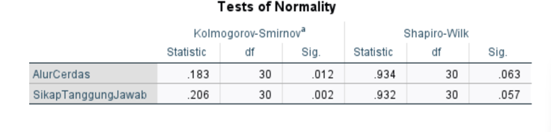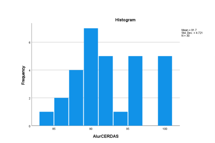Uji normalitas pada data dalam penelitian ini menggunakan Shapiro-Wilk karna sampel yang digunakan berjumlah 30 orang. Berdasarkan tabel di atas diperoleh data Alur CERDAS menunjukan nilai signifikansi > α (0,063 > 0,05) artinya data Alur CERDAS berdistribusi normal. Histogram data Alur CERDAS dapat dilihat pada gambar berikut.