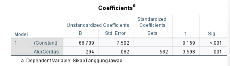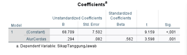 2. Koefisien arah regresi = 0,294 (bernilai positif) artinya apabila penggunaan alur pembelajaran CERDAS meningkat satu (1) satuan, maka sikap tanggung jawab juga akan mengalami peningkatan sebesar 0,294.