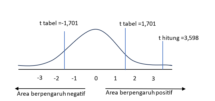 2. Nilai t tabel dengan jumlah variabel = 2 dan sampel = 30, maka diperoleh df = 28 dengan nilai signifikansi yang digunakan yaitu 0,05 sehingga diperoleh t tabel = 1,701. Berdasarkan tabel di atas nilai t hitung = 3,598 sehingga nilai t hitung> t tabel (3,598 > 1,701) yang dapat digambarkan sebagai berikut.