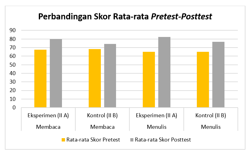 Hasil pretest menunjukkan bahwa kedua kelompok memiliki kemampuan awal yang relatif serupa, dengan rata-rata skor pretest kemampuan membaca permulaan di kelas eksperimen 67,45 dan di kelas kontrol 68,35. Untuk kemampuan menulis, rata-rata skor pretest di kelas eksperimen adalah 65,00 dan di kelas kontrol 65,15. Kondisi ini mengindikasikan bahwa kedua kelompok homogen pada awal penelitian.