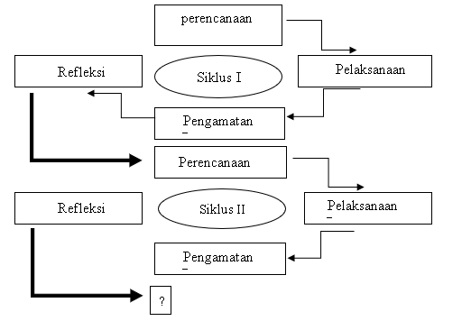 Menurut [23] Penelitian Tindakan Kelas (PTK) merupakan suatu pencermatan terhadap kegiatan belajar berupa tindakan, yang sengaja dimunculkan dan terjadi dalam sebuah kelas secara bersama. Berdasarkan pengertian PTK di atas, Jenis penelitian ini adalah Penelitian Tindakan Kelas atau Classroom Action Research yang dilakukan secara kolaboratif. Penelitian tindakan kelas ini dilakukan dalam beberapa siklus, dan masingmasing siklus terdiri dari empat tahap kegiatan, yaitu perencanaan (planning), tahap pelaksanaan (acting), tahap pengamatan (observasing), dan tahap refleksi berdasarkan hasil pengamatan (reflecting).