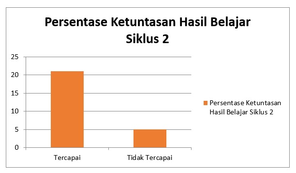 Pencapaian hasil belajar pada siklus II menunjukkan peningkatan yang cukup signifikan. Dari 26 siswa, sebanyak 21 siswa (80,77%) dinyatakan tuntas, sedangkan hanya 5 siswa (19,23%) yang belum mencapai ketuntasan. Dibandingkan dengan siklus I yang hanya mencapai 57,69%, maka pada siklus II terjadi peningkatan ketuntasan sebesar 23,08%. Selain itu, terdapat beberapa siswa yang berhasil meraih nilai maksimal (100), yang sebelumnya belum terlihat pada siklus I.