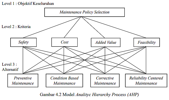 Penentuan alternatif strategi pemeliharaan yang bertujuan meminimalkan risiko pada penelitian ini dilakukan dengan metode Analytic Hierarchy Process (AHP), yang memberikan dukungan pengambilan keputusan secara sistematis berdasarkan sejumlah kriteria. Sebelum perhitungan AHP dilakukan, terlebih dahulu ditetapkan tujuan, kriteria, serta alternatif strategi yang akan dianalisis. Adapun model struktur hierarki AHP pada penelitian ini ditunjukkan pada Gambar 1 berikut.