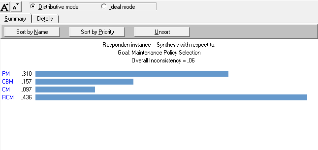 Berdasarkan Gambar 2, hasil sintesis bobot alternatif AHP untuk “Maintenance Policy Selection” menunjukkan bahwa RCM (Reability Centered Maintenance) menjadi strategi paling optimal dengan bobot 0,436 karena mampu menjaga keandalan peralatan. PM (Preventive Maintenance) menempati urutan kedua dengan bobot 0,310 melalui pemeliharaan terjadwal, disusul CBM (Condition Based Maintenance) dengan bobot 0,157 yang digunakan bila tersedia data kondisi peralatan. CM (Corrective Maintenance) berada pada prioritas terendah dengan bobot 0,097 karena bersifat reaktif.
