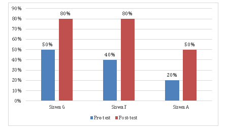 Berdasarkan tabel tersebut, nilai Post-Test tes hasil belajar rangkaian listrik seri mengalami peningkatan dari Pre-Test. Tes hasil belajar penguasaan kosakata. Siswa G memperoleh nilai Pre-Test sebesar 50% dan memperoleh nilai Post-Test sebesar 80%. Siswa G memperoleh selisih nilai lebih baik antara Pre-Test dengan Post-Test sebesar 30%. Siswa F memperoleh nilai Pre-Test sebesar 40% dan memperoleh nilai Post-Test sebesar 80%. Siswa F memperoleh selisih nilai lebih baik antara Pre-Test dengan Post-Test sebesar 40%. Siswa A memperoleh nilai Pre-Test sebesar 20% dan memperoleh nilai Post-Test sebesar 50%. Siswa A memperoleh selisih nilai lebih baik antara Pre-Test dengan Post-Test sebesar 30%.