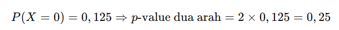 Dengan jumlah data bertanda n = 3 dan nilai terkecil dari tanda positif atau negatif (x = 0), dilakukan perhitungan p-hitung menggunakan distribusi binomial dengan p=0.5. Hasil perhitungan menunjukkan bahwa nilai p-hitung = 0,125.