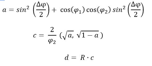 Here is the Haversine formula used to calculate the great-circle distance between two coordinate points:
