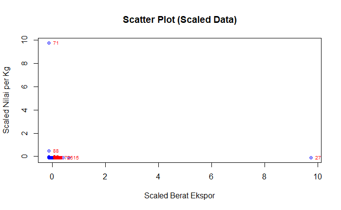 Meskipun data telah melalui proses standarisasi menggunakan Z-score, hasil visualisasi scatter plot masih menunjukkan adanya pencilan ekstrem (outlier) yang letaknya jauh dari mayoritas titik data. Hal ini menandakan bahwa transformasi atau standarisasi tidak selalu menghilangkan karakteristik ekstrem dari suatu observasi, terutama jika nilai aslinya sangat berbeda secara signifikan dari distribusi utama. Dalam proses analisis klaster aglomerasi, observasi dengan jarak yang sangat jauh dari klaster lainnya cenderung teridentifikasi sebagai klaster tersendiri, karena algoritma hierarkis akan menggabungkannya terakhir akibat jarak kemiripan yang besar. Keberadaan klaster tunggal seperti ini dapat menunjukkan komoditas yang sangat unik, baik karena nilai per kilogramnya sangat tinggi atau volumenya jauh di atas komoditas lain.