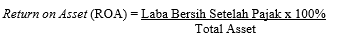Profitabilitas penelitian int diukur melalui return on Asset (ROA). Profitabilitas menunjukkan efektifitas perusahaan dalam menghasilkan tingkat keuntungan dengan serangkaian pengelolaan aset yang dimiliki perusahaan. Sehingga profitabilitas mampu untuk mempengaruhi persepsi investor terhadap perusahaan mengenai prospek perusahaan dimasa yang akan datang. Karena dengan tingkat profitabilitas yang tinggi, maka akan semakin tinggi juga minat investor terhadap harga saham perusahaan [11]. Adapun rumus dalam perhitungan return on asset menurut sebegai berikut.
