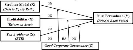 Dari trade off-theory yang menjelaskan bahwa nilai perusahaan akan meningkat jika struktur modal berada di bawah titik optimal dan jika perusahaan meningkatkan rasio utangnya. Penerapan good corporate governance dalam perusahaan menunjukkan kemampuan perusaahaan dalam mengelola perusahaan. Mekanisme corporate governance merupakan suatu hubungan antara pihak pengambil keputusan dengan pihak yang melakukan pengawasan terhadap keputusan [22]. Hasil penelitian yang dilakukan [23] menunjukkan bahwa struktur modal memiliki pengaruh positif terhadap nilai Perusahaan yang dimoderasi oleh good corporate governance. Dari uraian diatas, hipotesis yang dibuat adalah sebagai berikut: