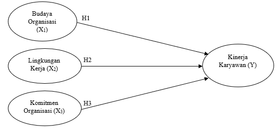 Berdasarkan hasil pembahasan mengenai pengaruh budaya organisasi, lingkungan kerja dan komitmen organisasi terhadap kinerja karyawan, dapat diberikan beberapa kesimpulan yaitu (1) variabel budaya organisasi (X1) berpengaruh negatif terhadap kinerja karyawan terbukti dari hasil uji hipotesis parsial (uji t) dengan tingkat signifikansi negatif (2) variabel lingkungan kerja (X2) berpengaruh positif terhadap kinerja karyawan dari hasil uji hipotesis parsial (uji t) dengan nilai t hitung lebih besar dari t tabel (3) variabel komitmen organisasi (X3) berpengaruh positif terhadap kinerja karyawan dari hasil uji hipotesis parsial (uji t) karena nilai t hitung lebih besar dari t tabel.