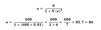 Hasil perhitungan menurut rumus diatas didapatkan n = 86 yang kemudian dibulatkan menjadi 86 orang. Sehingga, banyak sampel penelitian yang diperlukan untuk jumlah karyawan PT. Panca Mitra Multperdana Tbk Situbondo sebanyak 86 orang.