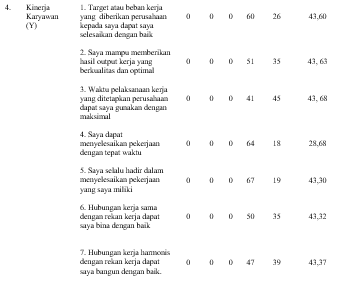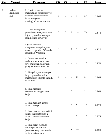 Berdasarkan keterangan pada tabel 7 diatas, hasil responden kuisioner yang sudah dilihat mengenai variabel budaya organisasi (X1), lingkungan kerja (X2), Komitmen Organisasi (X3) dan Kinerja Karyawan (Y) banyak yang menjawab setuju dan sangat setuju, dari semua pertanyaan dari kuisioner yang sudah dijelaskan, untuk jumlah nilai rata-rata (mean) ternyata hasilnya berbeda-beda.