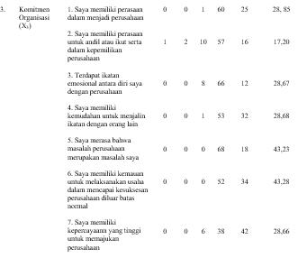 Hasil analisis perhitungan uji t, variabel komitmen organisasi (X3) memiliki pengaruh positif sebesar 0,195 dengan nilai t hitung sebesar 2,091 lebih besar dari nilai t tabel sebesar 1,989.
