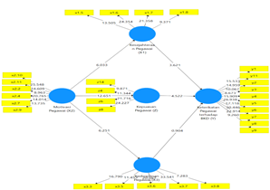 Setelah menilai inner model maka hal berikutnya mengevaluasi hubungan antar konstruk laten seperti yang telah dihipotesiskan dalam penelitian ini. Uji hipotesis pada penelitian ini dilakukan dengan melihat T-Statistics dan nilai P-Values. Hipotesis dinyatakan diterima apabilai nilai T-Statistics > 1,96 dan P-Values < 0,05. Penelitian terdahulu yang dilakukan oleh [41] juga menunjukkan bahwa penggunaan bootstrapping T-Statistics dan P-Values merupakan metode yang efektif untuk menguji signifikansi hubungan antar konstruk laten dalam model struktural. Berikut ini adalah hasil Path Coefficients pengaruh langsung: