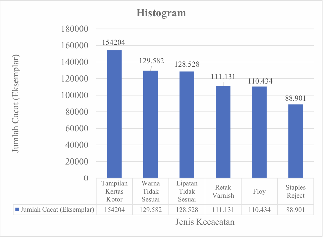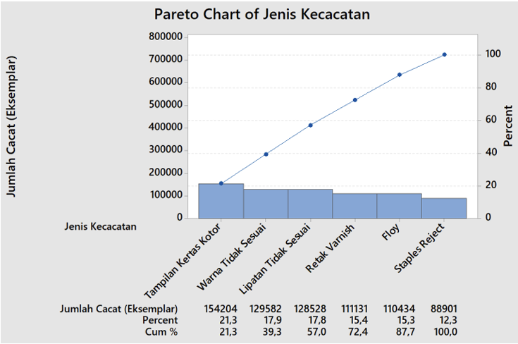 Berdasarkan Gambar 1 diatas dapat diketahui urutan jenis kecacatan pada produk buku dongeng dari jumlah tertinggi hingga terendah. Jenis kecacatan dengan jumlah terbesar adalah tampilan kertas kotor 154.204, warna tidak sesuai sebanyak 129.582, lipatan tidak sesuai 128.528, retak varnish 111.131, floy 110.434, dan staples reject 88.901.
