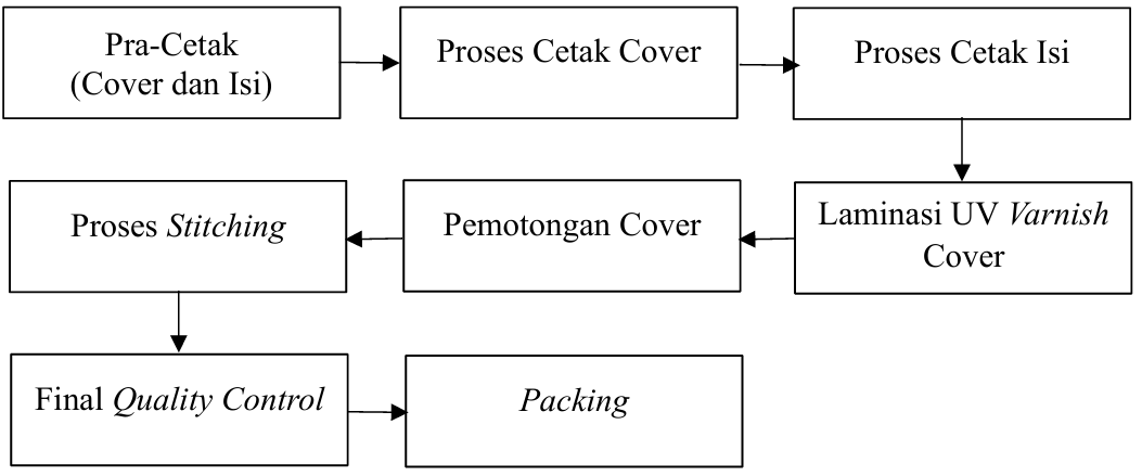 Berdasarkan penelitian di PT XYZ, kualitas produk buku dongeng dinilai masih rendah karena tingkat kecacatan yang cukup tinggi sehingga diperlukan perbaikan pada proses produksi agar sesuai standar kualitas, dengan cacat dominan menurut diagram pareto meliputi tampilan kertas kotor pada proses percetakan isi (21,3%), warna tidak sesuai pada percetakan cover (17,9%), lipatan tidak sesuai pada percetakan isi (17,8%), retak varnish pada laminasi UV cover (15,4%), floy pada percetakan isi (15,3%), dan staples reject (12,3%). Rekomendasi perbaikan berdasarkan faktor penyebab dengan skor FRPN tertinggi antara lain menetapkan standar suhu dan kelembaban serta pemantauan lingkungan dan sistem pengendalian lingkungan untuk menekan cacat lipatan tidak sesuai (FRPN 3,42), menerapkan pengecekan hasil lipatan berkala menggunakan lembar kontrol serta meningkatkan pengawasan operator selama produksi (FRPN 3,11), melakukan kalibrasi unit lipat, menetapkan parameter kecepatan standar, dan pengecekan berkala selama produksi (FRPN 2,86), meningkatkan pemeriksaan bahan baku kertas terutama gramasi dan konsistensi kualitas untuk menekan cacat lipatan tidak sesuai (FRPN 2,62) serta menerapkan inspeksi hasil jahitan berkala dan meningkatkan pengawasan proses stitching untuk cacat staples reject (FRPN 2,62), dan melakukan pengecekan warna berkala selama proses produksi dengan acuan proof untuk cacat warna tidak sesuai (FRPN 2,56). Adapun saran yang diberikan yaitu perusahaan perlu memperkuat pengawasan dan peninjauan faktor manusia, mesin, material, metode, dan lingkungan selama produksi, mempertimbangkan penerapan usulan perbaikan menggunakan metode SQC dan Fuzzy FMEA untuk pengendalian kualitas, memberikan pelatihan penggunaan mesin bagi seluruh tenaga kerja agar kualitas SDM meningkat, melakukan perawatan mesin secara berkala untuk menjaga performa proses produksi. Serta untuk penelitian selanjutnya disarankan menggunakan metode selain SQC agar dapat dibandingkan kelebihan dan kekurangannya.