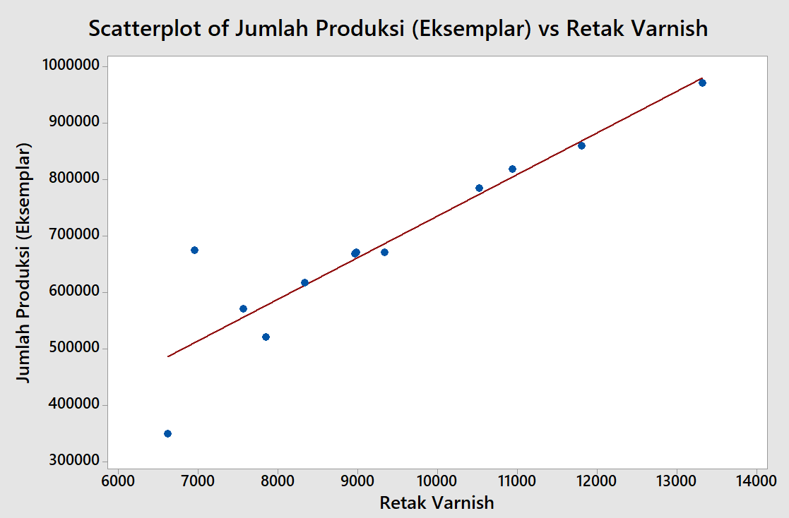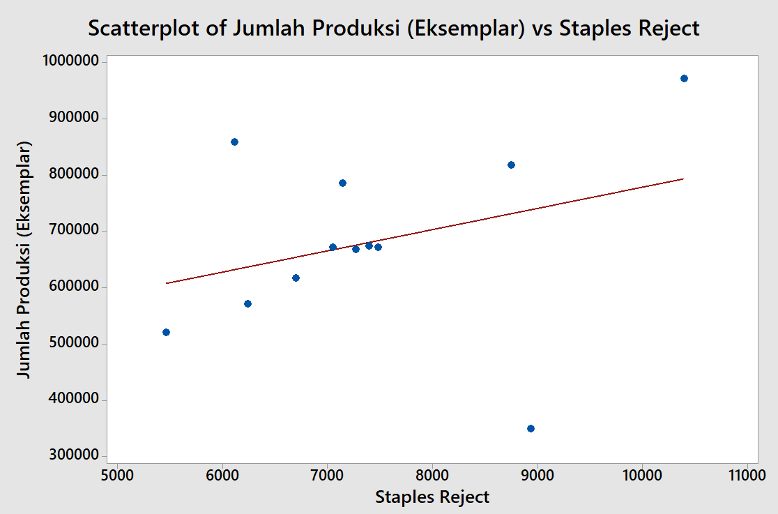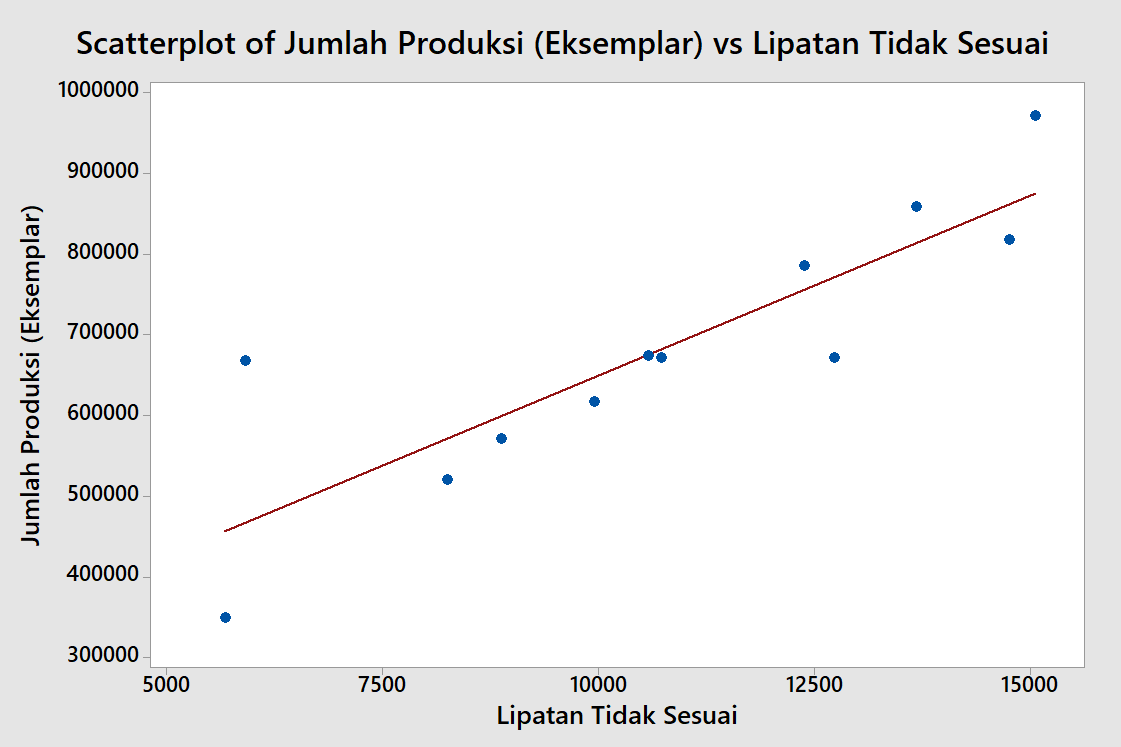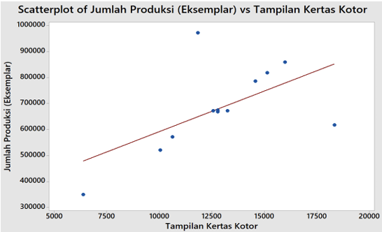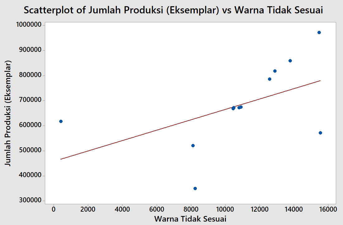 Diagram scatter dibawah ini keseluruhan menunjukkan bahwa garis regresi memiliki arah dari kiri ke kanan, yang artinya adanya hubungan positif antara jumlah produksi dengan jumlah kecacatan. Kondisi ini memperlihatkan bahwa peningkatan jumlah produksi cenderung diikuti oleh peningkatan jumlah kecacatan produk.