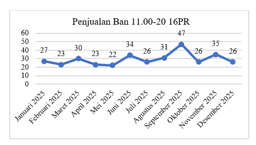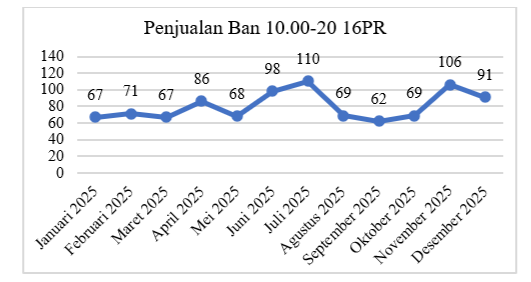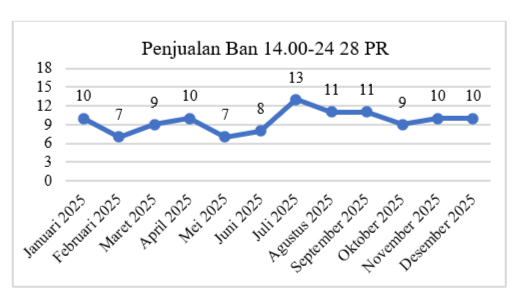 Setelah melakukan plot data historis mengenai data penjualan dari masing-masing ban alat berat, dapat diketahui bahwa data penjualan ketiga jenis ban selama bulan Januari hingga Desember 2025 memiliki pola horizontal, sehingga metode peramalan yang cocok digunakan untuk pola data ini adalah peramalan time series dengan menggunakan metode meliputi metode Moving Average (MA), metode Weighted Moving Average (WMA), dan metode Single Exponential Smoothing (SES).