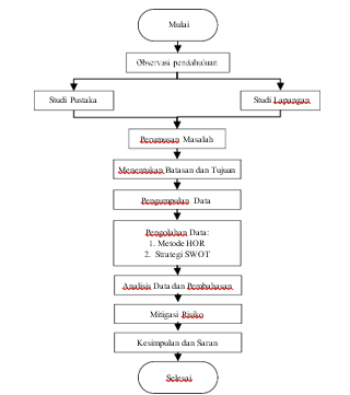 Observasi pendahuluan merupakan langkah awal yang dilakukan untuk menganalisis perusahaan secara umum, dilanjutkan untuk melaksanakan kajian lapangan serta kajian pustaka. Kajian lapangan untuk menggali informasi guna lebih detail mengenai tingkat risiko penyebab terjadinya kegagalan produk pada saat proses produksi tas UD. Novret Collection melalui wawancara dan pengamatan. Studi pustaka untuk mengumpulkan materi serta informasi yang keterhubungan pada penelitian yang dilaksanakan. Yang mana materi yang digunakan oleh peneliti adalah bersumber dari jurnal, buku, serta penelitian terdahulu yang pernah dilakukan. Perumusan masalah dilakukan untuk menganalisa resiko pada produksi tas UD. Novret Collection lewat pemakaian strategi House of risk (HOR), sehingga dapat dilakukan tindakan selanjutnya yakni tujuan rekomendasi perbaikan untuk meminimalisir terjadinya risiko. Menentukan batasan dan tujuan dilakukan untuk mendefinisikan tujuan dilakukannya penelitian.