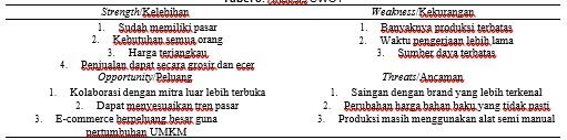 Analisa dan pembahsan merupakan tahap pengolahan seluruh data. Rekomendasi perbaikan diberikan melalui analisa SWOT. Langkah analisis SWOT (strength, weakness, opportunities, dan threats). Strength merupakan aspek internal perusahaan dari segi kelebihan dan keuntungan bag pertumbuhan perusahaan [13]. Weakness merupakan kelemahan yang menggambarkan seberapa jau aspek yang menjadi kelemahan dalam perusahaan [14]. Opportunities merupakan peluang yang menguntungkan pada lingkungan perusahaan seperti perubahan teknologi ataupun peningkatan keterhubungan antaa perusahaan dengan konsumen [15]. Threats merupakan ancaman ataupun situasi buruk bagi perusahaan sekarang ataupun yang diinginkan perusahaan misalnya peraturan pemerintah [13]. Selanjutnya bisa diambil kesimpulan seperti pada penelitian yang dilaksanakan juga guna kelanjutan dari penelitian yang linier.