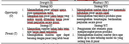 Strategi penanggulangan risiko dengan menggunakan metode SWOT guna perbaikan pada produksi tas UD. Novret Collection didapatkan berdasarkan hasil analisa SWOT dan perhitungan HOR tingkatan II. Penanggulangan risiko tersebut dipilih berdasarkan perhitungan ETDk dengan Angka 3 tertinggi. Penanggulangan risiko tersebut yaitu meningkatkan kualitas agar dapat bersaing dengan pasar yang lebih besar yang merupakan bagian dari strategi ST dengan Angka ETDk sebesar 5139. Rankprioritykedua terletak pada bagian strategi WT dengan Angka ETDk sebesar 1852,5, yaitu penggunaan alat otomatis guna mempersingkat proses produksi. Rank priority ketiga terletak pada strategi WT dengan Angka 1372 yaitu meningkatkan kualitas sumber daya agar lebih up to date terhadap model tas yang sedang tren di pasar.