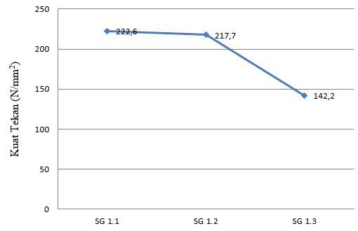 Pada grafik di atas, terlihat bahwa hasil uji kuat tekan menggunakan semen gresik tidak selalu sama. Kuat tekan yang dihasilkan sampel tiga (SG 1.3) mengalami penurunan yang drastis. Hal tersebut disebabkan oleh homogen yang dihasilkan berbeda.