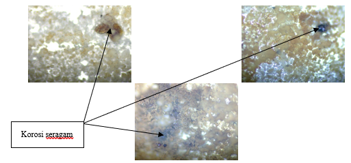 Dari hasil pengamatan mikro pada Gambar 8. menunjukkan bawah untuk cairan bertanda merah (H2O2) menunjukkan bahwa Sebagian permukaan terjadi tanda-tanda pengkeroposan terutama dalam bentuk bulatan hitam atau yang biasa disebut pitting corrosion (korosi sumur). Korosi sumur menyebar pada beberapa permukaan sampel.