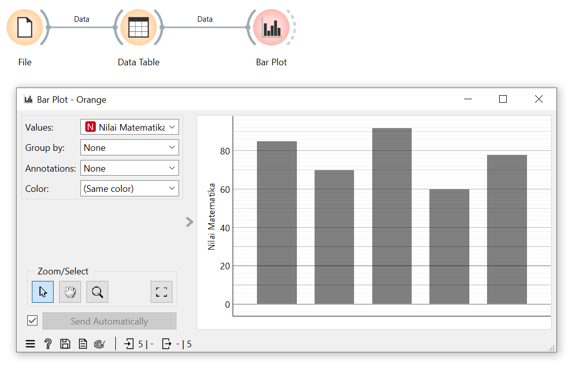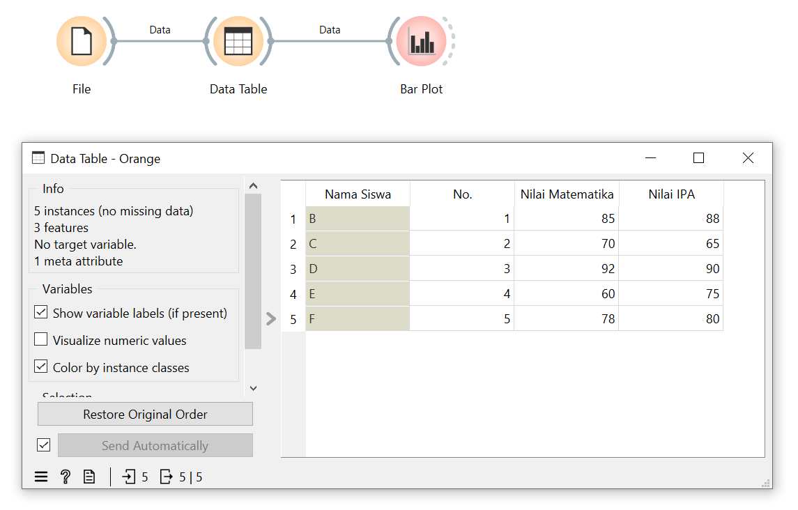 Pada sesi praktik ini, siswa akan secara langsung mengimplementasikan langkah-langkah dasar Eksplorasi Data Awal (EDA) menggunakan software Orange dengan dataset nilai yang sudah disiapkan. Siswa akan memulai dengan menggunakan widget File untuk memuat data dan widget Data Table untuk melakukan verifikasi struktur dan kualitas data. Berikut rangkaian treatment yang akan dilakukan oleh siswa :