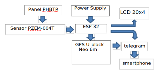 Gambar 2.2 prinsip kerja blok diagram yaitu blok diagram sistem monitoring panel PHBTR. Dapat diketahui bahwa sensor PZEM-004T berfungsi mendeteksi aliran listrik dalam rangkaian sensor ini akan menghitung nilai tegangan, arus dan daya pada rangkaian kelistrikan sistem. Hasil pembacaan sensor diproses oleh microcontroller ESP 32 hasil pengolahan data pada microcontroller ESP 32 ditampilkan pada layar LCD 20x4 selain itu data juga dikirim kan menuju server telegram secara online untuk ditampilkan pada smartphone. Apabila tegangan dibawah 220,diatas 245 dan 0 volt maka microcontroller secara langsung mengirimkan titik lokasi panel yang terjadi gangguan[7]