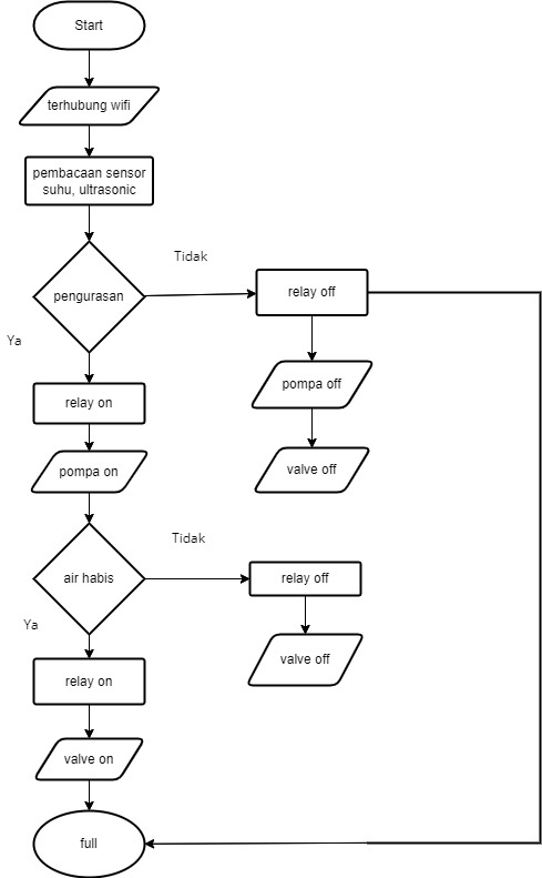 Ketika system dijalankan, pertama ESP32 akan melakukan koneksi ke wifi serta mulai pembacaan sensor suhu dan pembacaan sensor ultrasonik, lalu memuat data pembacaan. Sistem akan membaca ketinggian air apakah dalam kondisi 100% jika tidak maka otomatis air akan mengisi sendiri sampai kondisi 100%.