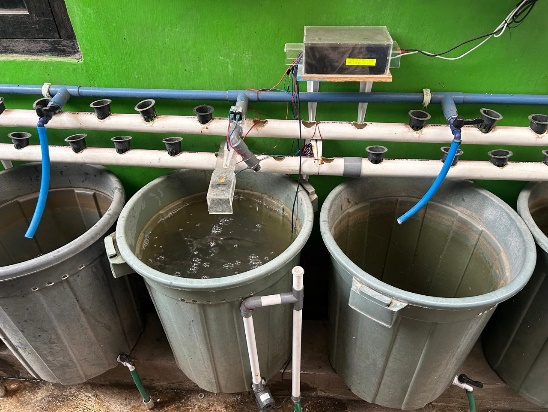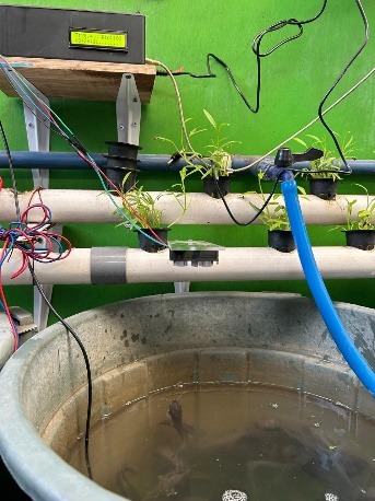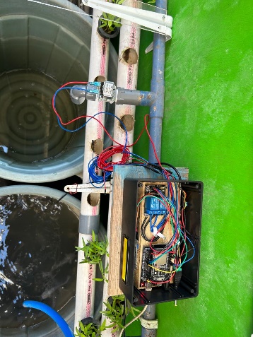 Pada gambar 5 peneliti mulai menempatkan alat yang sudah dirangkai pada media budidamber antara lain ESP 32, senor suhu, sensor ultrasonik, Rellay, LCD, power Supply, kabel jumper, valve, dan pompa.Dimana untuk item inti seperti ESP 32, LCD, relay, dan sambungan Power Supply ditempatkan pada box kotak hitam ukuran 18,5cm, lebar 11,5cm, dan tinggi 6,5cm agar terlindungi dari hujan, selanjutnya pengujian ini dilakukan agar peneliti dapat mengetahui kelemahan, kelebihan, dan eror dari alat penguji.