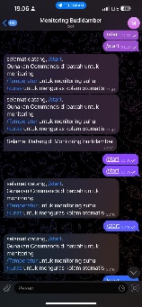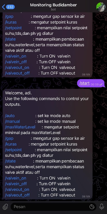 Pengujian aplikasi bot telegram dilakukan seperti pada gambar 6 yang menampilkan balasan pesan, ketika penguji mengirim perintah /Start berhasil. Maka akan menampilkan perintah cek suhu, perintah cek ketinggian air, perintah pengurasan air, dan perintah pengurasan manual.
