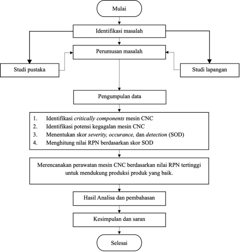 Mesin yang digunakan dalam penelitian ini adalah jenis mesin CNC milling. Mesin digunakan untuk memotong alumunium. Mesin ini beroperasi secara terus-menerus sehingga rentan mengalami kerusakan. Hasil studi lapangan diketahui dalam waktu dua tahun mesin CNC milling memiliki jumlah frekuensi kerusakan yang cukup banyak, yaitu sebanyak 31 kali. Berdasarkan pengamatan di lokasi, kerusakan yang sering terjadi adalah mesin cutter yang digunakan untuk pemotongan alumunium mudah tumpul dan kerusakan bearing rel yang mudah berkarat (permukaannya tidak lagi rata). Hal tersebut berdampak beberapa kerugian bagi PT. IJA Surabaya. Kerugian ini berupa penurunan produktivitas mesin dan terganggunya proses produksi, sehingga berkurangya keuntungan yang dihasilkan oleh perusahaan karena terhentinya proses produksi. Dampak kerugian yang terjadi adalah gagalnya penerapan visi perusahaan dalam upaya mengurangi tingkat breakdown time tahun 2023 sebesar 20,5% menjadi 10% di tahun 2024 ini. Oleh karena itu, diperlukan suatu rencana perawatan mesin CNC untuk meminimalisir terjadinya kerusakan.