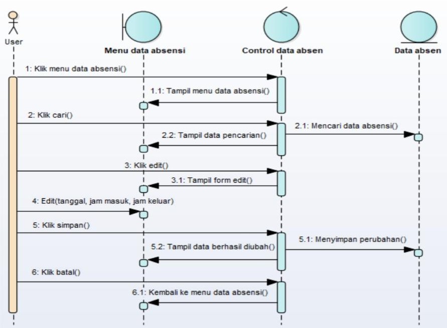 Dalam prosesnya, karyawan melakukan absensi melalui aplikasi yang tersedia, baik melalui perangkat mobile maupun desktop. Sistem kemudian melakukan verifikasi kehadiran secara realtime dengan berbagai metode, seperti pencocokan lokasi menggunakan GPS (Global Positioning System), pemindaian wajah menggunakan Foto Selfie. Setelah proses verifikasi selesai, data kehadiran karyawan akan disimpan secara otomatis ke dalam database, yang nantinya dapat diakses oleh admin untuk kebutuhan monitoring dan manajemen kehadiran. Selain itu, Sequence Diagram ini juga menunjukkan bagaimana sistem secara otomatis mengelola dan memperbarui laporan kehadiran berdasarkan data yang masuk 15. Admin dapat mengakses laporan tersebut melalui dashboard yang disediakan dalam aplikasi, memungkinkan mereka untuk melihat rekapan kehadiran, mendeteksi ketidakhadiran, serta melakukan koreksi jika diperlukan. Dengan adanya proses ini, sistem dapat memastikan bahwa pencatatan absensi dilakukan secara akurat, transparan, dan up-to-date, sehingga meminimalkan risiko kecurangan dan meningkatkan efisiensi dalam manajemen kehadiran karyawan 16.