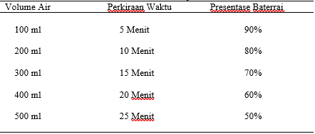 Tabel dia atas menunjukkan, volume air, perkiraan waktu dan presentase baterrai. dimana setiap peningkatan 100ml volume air membutuhkan tambahan waktu 5 menit, ini menunjukkan apabila seiring bertambahnya air, maka perkiraan waktu tersebut juga akan bertambah. Pada saat penggunaan alat dimana kondisi daya baterai 100%, maka setiap 5 menit daya akan turun sebesar 10%, dengan beban yang telah terpasang yaitu thermocouple atau pemanas yang berdaya 10 amper. Penggunaan baterai bisa di lakukan dua kali apabila kondisi volume air 500 ml. Jadi jumlah daya tahan baterai ialah 50 menit, tergantung volume air yang ingin di panaskan. Ketika suhu melebihi batas yang ditetapkan, pemanas akan otomatis mati. Sebaliknya, jika suhu turun di bawah batas tersebut, pemanas akan menyala kembali. Mekanisme ini memungkinkan suhu tetap stabil dalam waktu singkat.[14]