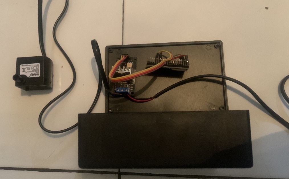 Gambar 5 Merupakan tampak dalam dari alat yang dibuat setelah dipasang, dihubungkan dengan kabel jumper, dan dikemas dengan project case. Secara keseluruhan, menggerakkan slider pada blynk sesuai dengan kebutuhan intensitas air yang akan digunakan kemudian dikirimkan menuju ESP32 yang mana dari sana akan diteruskan ke AC Light Dimmer untuk diatur kecepatan sesuai dengan pembacaan dari slider blynk yang aman akan menggerakkan motor pada pompa air tersebut. Sebagai supply daya, digunakan kabel yang dihubungkan ke stop kontak. ESP32 memiliki voltage regulator 3,3V yang menjadi penyuplai daya untuk AC Light Dimmer.