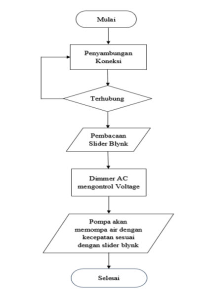 Gambar 3Dalam sistem yang akan dijalankan mulai dengan menyambungkan koneksi wifi yang sudah disambungkan memalui program yang mana ketika terhubung maka akan terkoneksi pada blynk yang ada di smartphone untuk mengatur kecepatan pompa air tersebut menggunakan slider yang ada kemudian mengatur pada dimmer AC untuk mengatur kecepatan putaran motor pompa air agar intensitas air sesuai dengan kebutuhan.