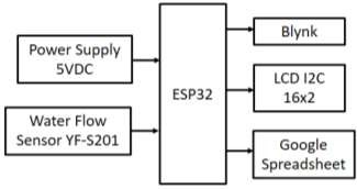 Untuk mempermudah proses perancangan sistem diperlukan blok diagram sistem. Blok diagram mempunyai input yaitu sensor water flow sensor YF-S201 sebagai penghitung debit air PDAM yang digunakan. Kemudian di proses pada ESP32 untuk proses pengolahan data. ESP32 melaui InternetofThingsmemberikan data yang dihasilkan oleh inputan untuk dapat dijadikan database pada google spreadsheet secara real-time dan dapat dilihat dimanapun berada. Kemudian untuk memudahkan pengguna untuk memonitorinng pemakaian air ketika posisi di rumah diberikan LCD I2C 16x2 dan blynk untuk debit air dan harga air PDAM yang telah digunakan.. Berikut merupakan blok diagram sistem yang digunakan pada gambar 1.