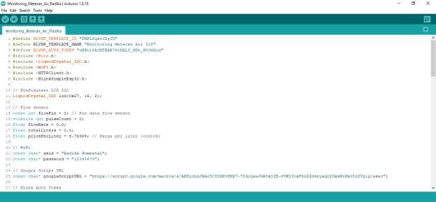 terdapat authtokenyang digunakan untuk integrasi dengan aplikasi blynk, serta nama server dari Google Apps Script yang berperan dalam menghubungkan sistem dengan Google Spreadsheet.
