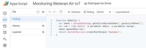 Gambar 4. menampilkan proses pembuatan program menggunakan Google Apps Script, yaitu platform berbasis JavaScript yang disediakan oleh Google untuk mengotomatisasi dan meningkatkan fungsi Google Sheets serta Google Drive. Dalam program tersebut, terdapat parameter yang mencakup data debit dan harga.