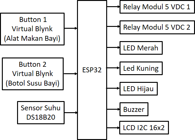 Blok diagram sistem dari alat ini mempunyai inputan, yaitu terdapat 2 button virtual yang ada pada blynk sebagai mode 1 untuk alat makan dan mode 2 untuk alat minum serta terdapat sensor suhu DS18B20 yang mempunyai akurasi suhu mulai -100C hinga 850C. Kemudian sinyal dikirim melalui blynk cloud dikelola dan diproses oleh mikrokontroller ESP32 untuk menghasilkan sinyal output. Output dari ESP32 berupa relay modul 5 VDC 1 untuk sistem pengering, relay modul 5 VDC 2 untuk sistem sterilisasi, LED berwarna hijau sebagai indikator mesin start pada posisi awal, LED berwarna kuning sebagai indikator mesin dalam proses sterlisasi serta LED merah dan buzzer sebagai penanda proses sterilisasi telah selesai. Terdapat juga LCD I2C 16x2 sebagai penampil nilai suhu yang terbaca oleh sensor suhu DS18B20 Sistem sterilisasi berbasis Internet of Things ini menggunakan aplikasi blynk pada smartphone. Berikut merupakan blok diagram sistem yang digunakan pada gambar 1.