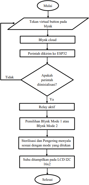 Flowchart sistem alat sterilisasi UV-C pada peralatan makan dan minum bayi berbasis Internet of Things menggambarkan alur kerja otomatis dimulai dari menyalakan alat. Setelah itu, pengguna dapat memilih mode sterilisasi dengan menekan virtual button 1 untuk alat makan bayi atau virtual button 2 untuk botol susu bayi, yang kemudian mengaktifkan sensor suhu DS18B20 untuk memantau kondisi lingkungan. Sinyal digital dari proses ini dikirimkan oleh mikrokontroler ESP32 ke platformblynkclouduntuk menginisialisasi perintah. Jika perintah berhasil diterima, maka modul relay akan aktif dan menghidupkan sistem pengering serta lampu UV-C. Proses pengeringan