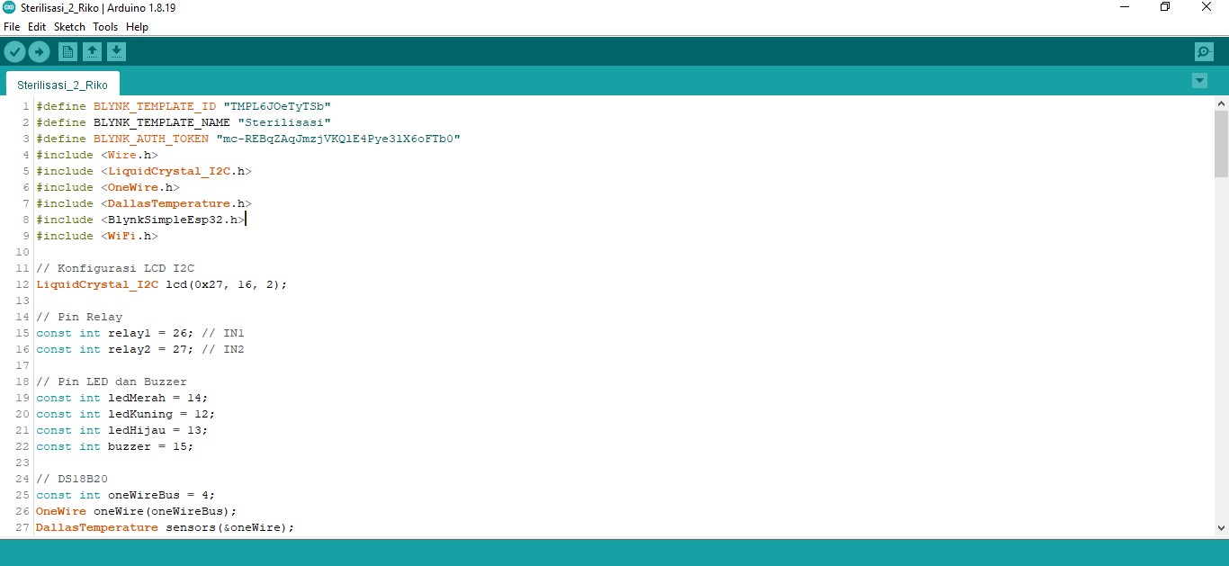 Gambar 3. menunjukkan pembuatan sketchprogrampada Arduino IDE. Alat ini menggunakan boardESP32 dengan library DallasTemperature.h , BlynkSimpleKesp32.h , dan LiquidCrystal_I2C.h.