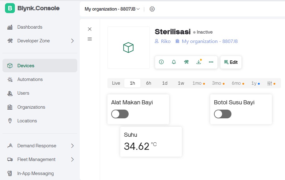 Gambar 4. memperlihatkan langkah-langkah dalam pembuatan template pada aplikasi Blynk. Template ini dibuat untuk memperoleh auth token yang nantinya diintegrasikan dengan board ESP32. Pada antarmuka Blynk digunakan tombol virtual dengan pin V0 untuk tombol menyalakan mode alat makan bayi, pin V1 untuk tombol menyalakan mode botol susu bayi, dan V2 untuk menampilkan suhu pada ruang sterilisasi.